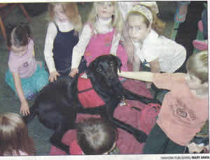 Shanahan took Suzie-Q to the Ayer Public Library on April 19 where she served as a quiet, supportive audience member for young readers taking part in the Thursday morning early readers program offered by children's librarian "Miss Amy" Leonard.