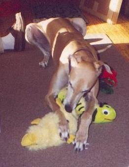 Before John and I knew her, she was a track dog and raced in Florida under the name Phlash Princess. She later came to Mass. and continued to race until the age of five, when John and I were lucky enough to adopt her and bring her home. She was a very happy dog with lots of energy and an exuberant spirit. Her favorite thing of all to do was run with her friends, and run laps in the backyard chasing her squeaky toy. She also enjoyed meeting people, especially children, as she always acquired a very gentle demeanor in the company of them. She loved to ride in the car and this past spring we took her to enjoy a family vacation in the Berkshires. Star was a celebrity! Twice she was written up in the Boston Globe....once in 2002 in an article promoting a Greyhound Friends open house, and again in 2003 when she became a registered therapy dog and participated in a program where children would practice their reading skills by reading to her. Since patience was her strong suit, the children would not feel discouraged whenthey mispronounced a word! In the last year of her life, she decided she'd like to help more greys like her find homes, so she participated in several "meet & greets" for Greyhound Friends of Hopkinton. During these mom would talk to potential adopters about the breed while she would turn on the charm and show them what loving personalities greyhounds have.